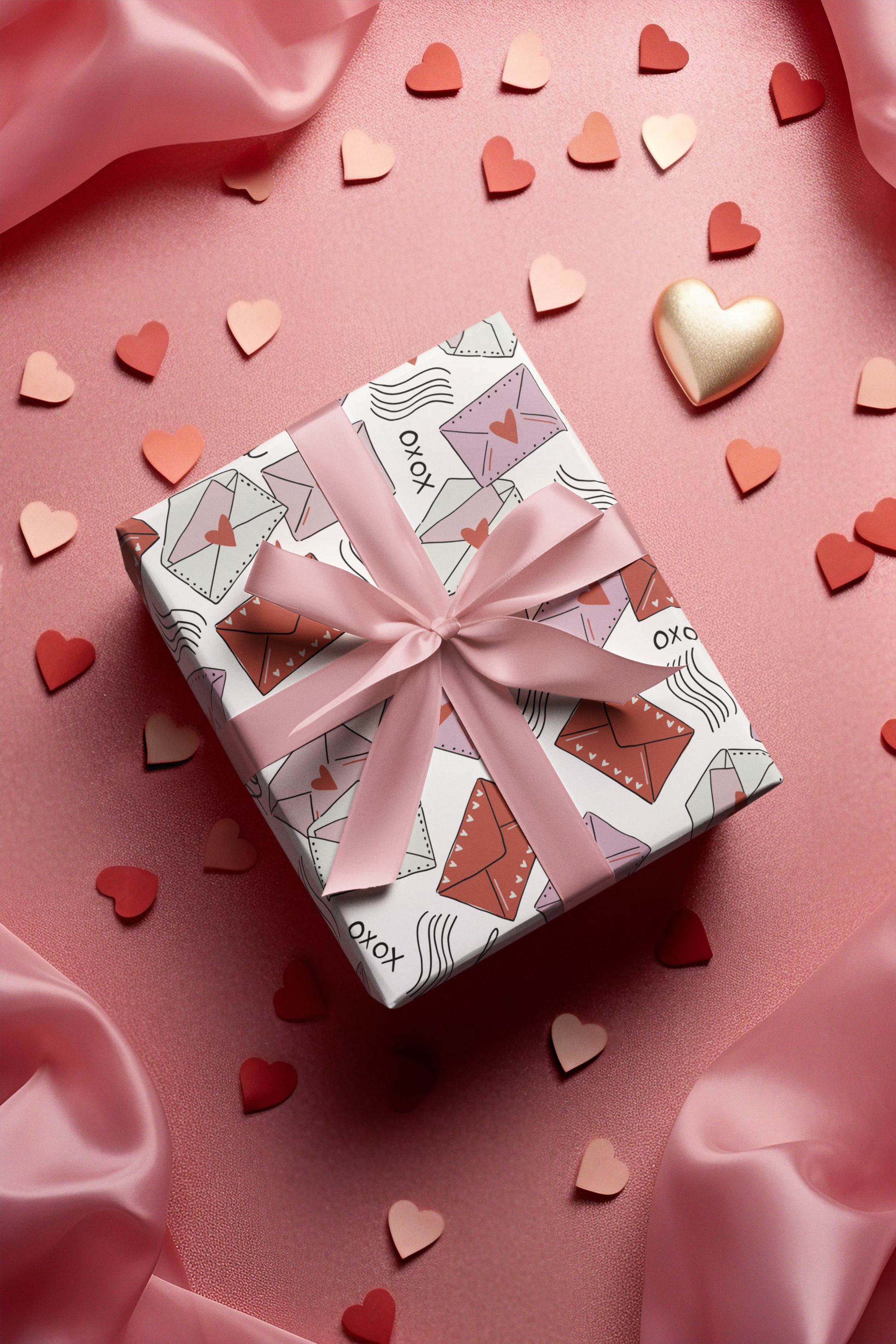 - Pattern: Envelopes, hearts, and love notes in red, pink, and cream on a white background.